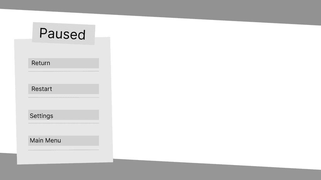 One of the main things I wanted to achieve with the main menu and pause menu was 'less is more'. I wanted the information behind the UI to be visible. For the main menu this was because we were going to have a 3D background that would be the main attraction on the screen. For the pause menu, I found it important to show the paused gameplay, to give the player some feed-forward for when they would un-pause.