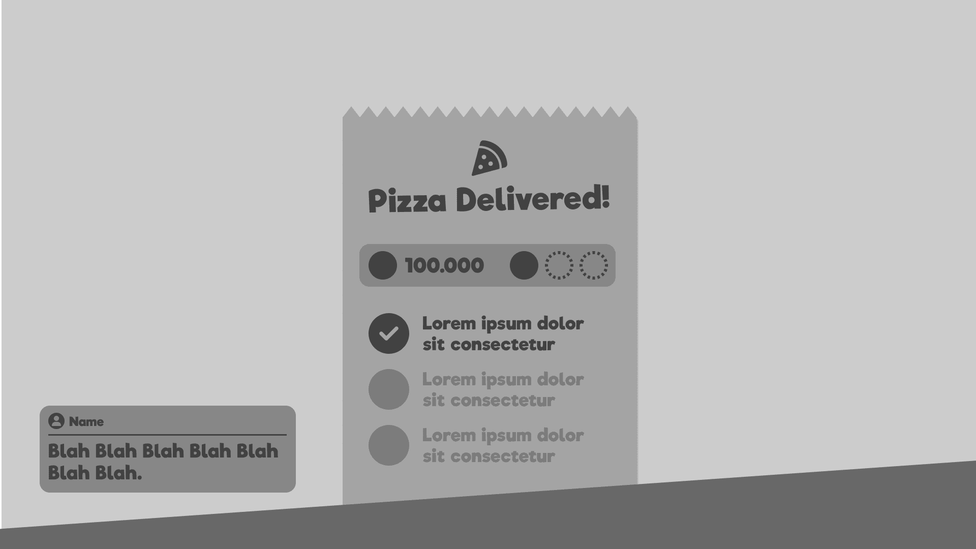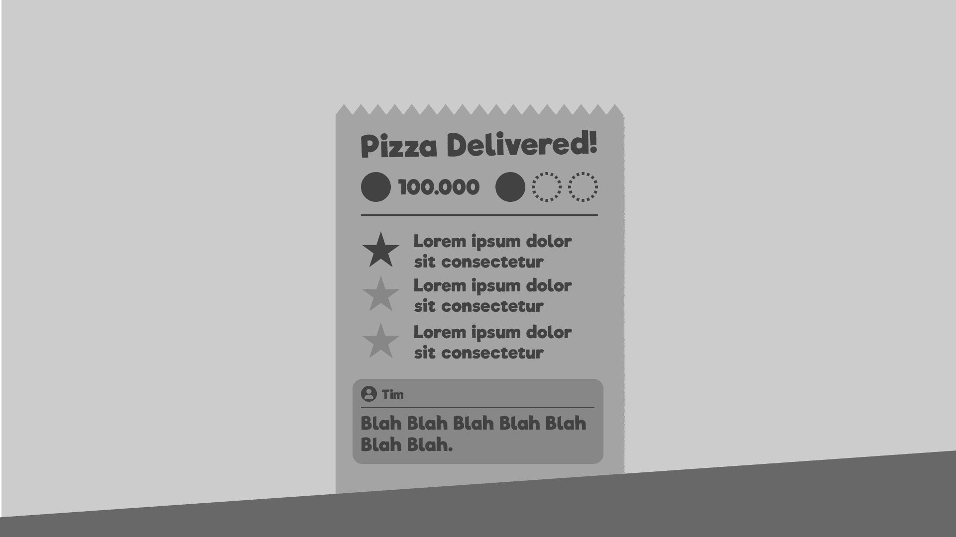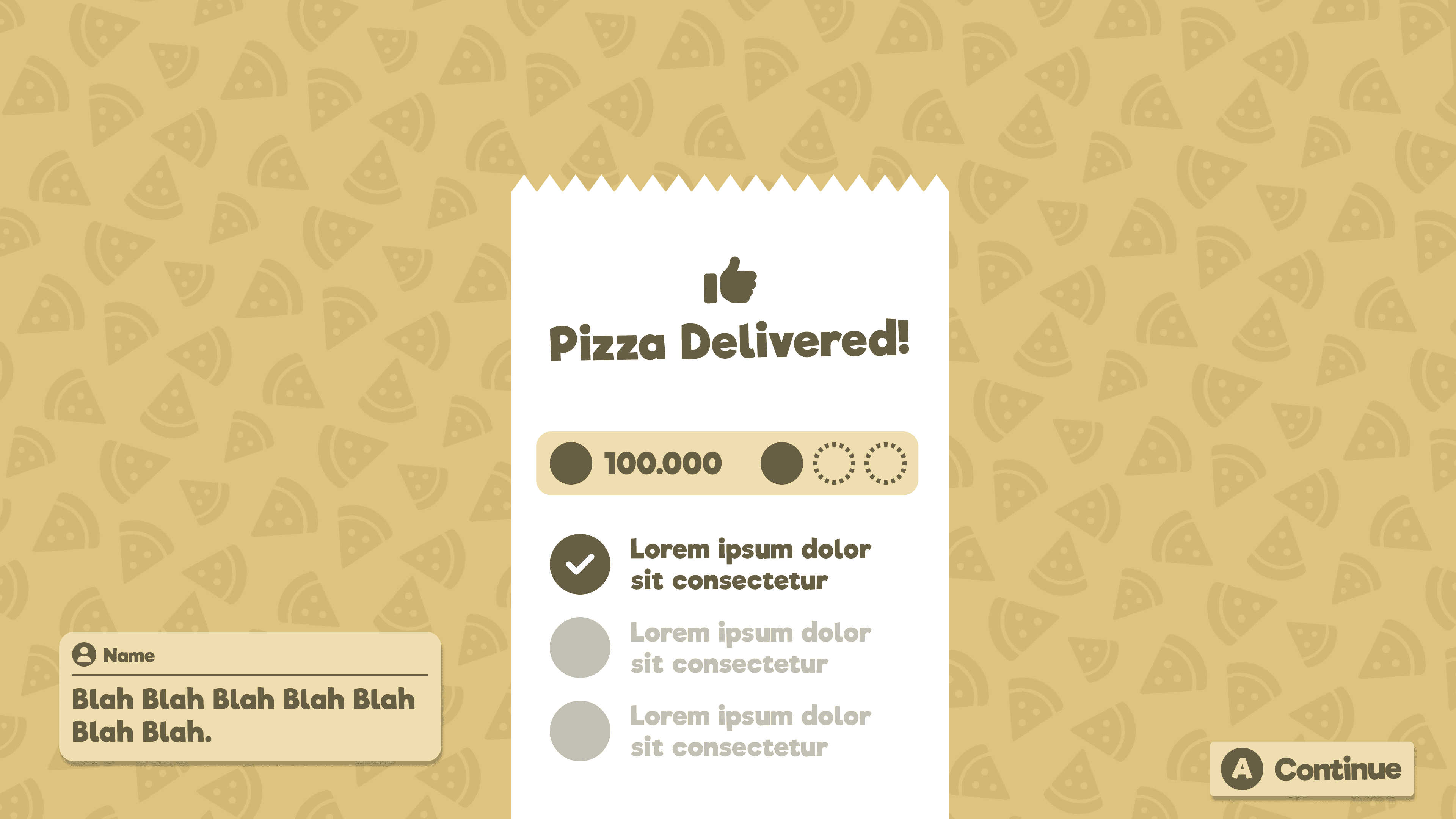 As the game was themed around a pizza delivery man, I wanted to reflect this delivery aspect in the victory screen, by showing a receipt with the final scores on top of it, and a randomly picked customer review somewhere in the design as well.