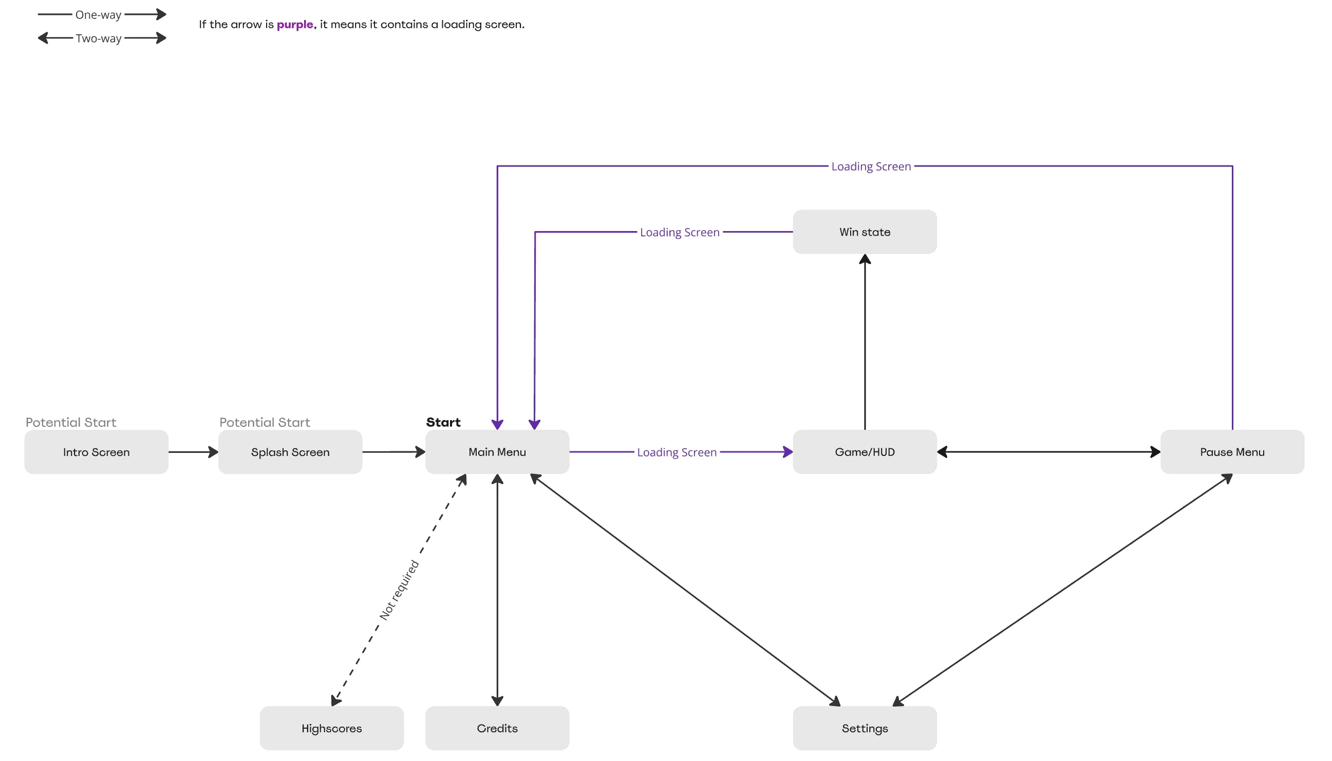 Getting started, I made a flowchart of the UI menus to communicate to my team how the UI would work for the user. I needed to know where certain menus or other UI elements were required in the game, and this helped me with that. This allowed me to already start to work on the UI without needing any visual direction.